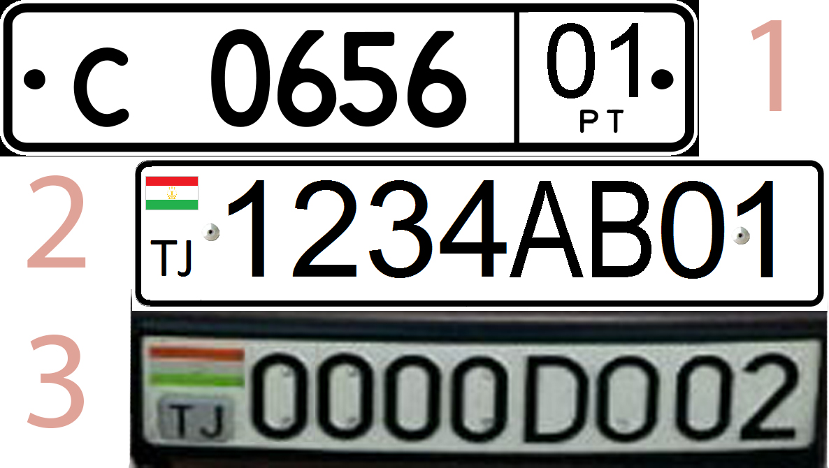 До 1996 года в Таджикистане на автомобилях были госномера по советским стандартам. После появились свои номера по современному российскому аналогу. Единственным отличием было то, что в окошке региона вместо «RUS» и российского флага маленькими буквами писалось «РТ», а флаг отсутствовал.