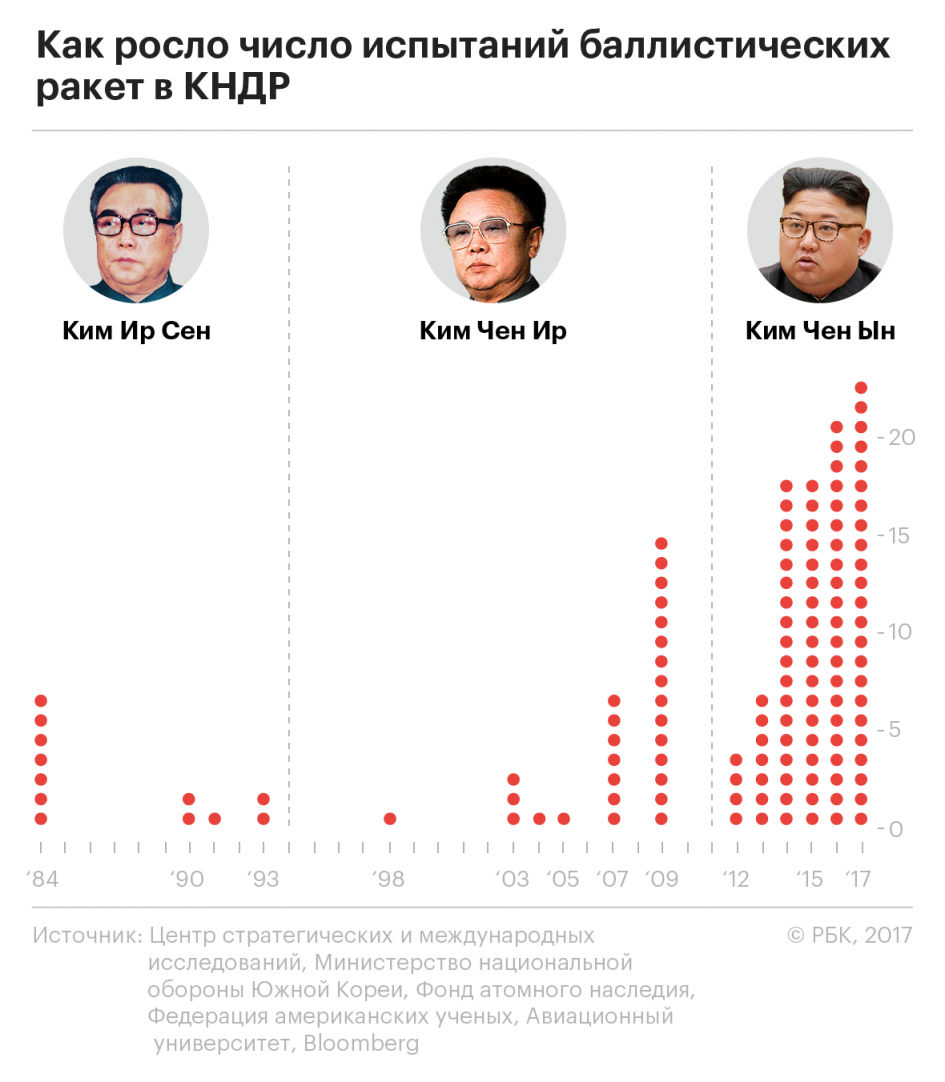 Алексей Арбатов в разговоре с РБК заявил, что Северная Корея имеет от 80 до 100 баллистических ракет разной дальности (от 100–200 км до 1000–1500 км).