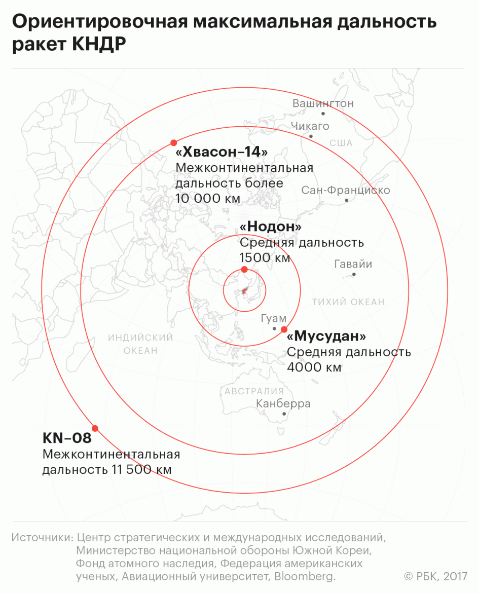Баллистическая ракета средней дальности (БРСД) «Нодон-1» способна преодолевать расстояние около 1,5 тыс. км, то есть способна поразить Японию и Южную Корею. Другая БРСД, «Мусудан», теоретически может преодолевать до 4 тыс. км (ее испытания не были успешными). Испытанная в мае 2017-го «Хвасон-12» может поражать цели в радиусе примерно 4,5 тыс. км (американский Гуам находится в 3,4 тыс. км от КНДР). Межконтинентальная баллистическая ракета «Хвасон-14», впервые испытанная в июле 2017 года, способна доставить заряд на расстояние более 10 тыс. км, то есть может достичь пределов США. По некоторым данным, ракеты этих модификаций способны нести ядерные боеголовки.