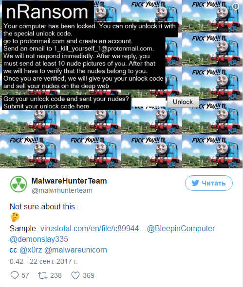 21 сентября на сайт с образцами вирусов VirusTotal загрузили образец необычной программы: вирус-вымогатель nRansom блокирует компьютер и требует выкуп в виде обнаженных фотографий пользователя, пишет Медуза.