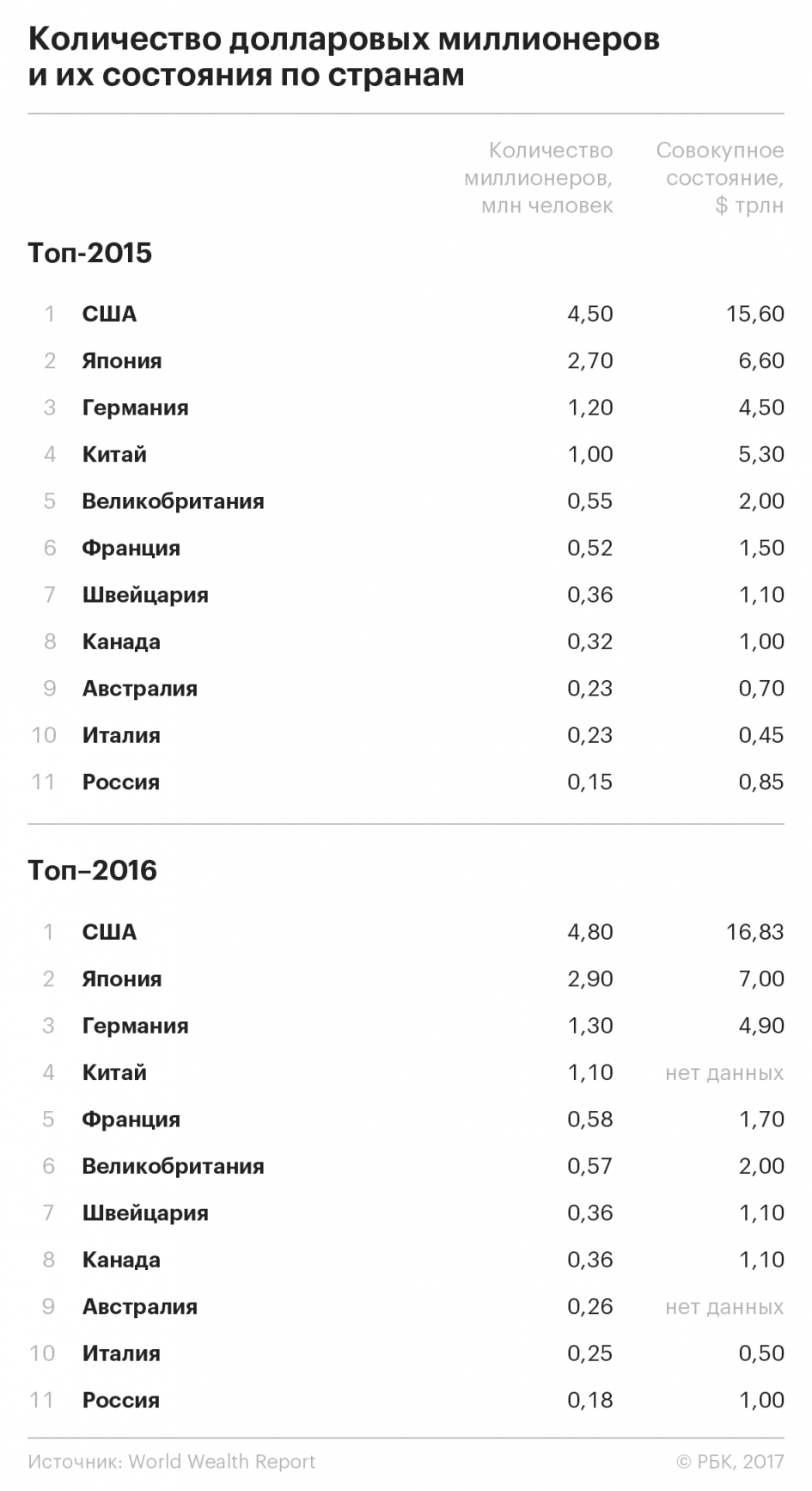 По числу миллионеров среди стран мира Россия занимает только 15-е место, обгоняя такие страны, как Саудовская Аравия, Кувейт и Норвегия. В тройке лидеров — США (там миллионеры — 4,8 млн человек), Япония (2,9 млн), Германия (1,2 млн). Китай расположился на четвертой строчке с 1,1 млн миллионерами. На эти четыре страны приходится 61% от общего количества миллионеров в мире.