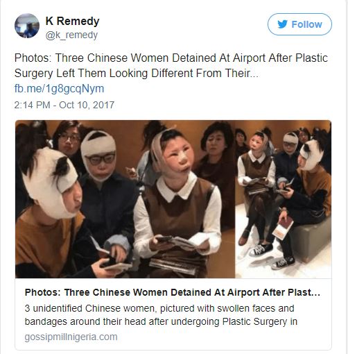 Из-за отеков и бинтов после пластической операции они попали в затруднительную ситуацию на иммиграционном контроле, о которой китайские пользователи Сети узнали в воскресенье, после того как китайская телеведущая Цзяньхуа Хуа разместила фотографию в своем аккаунте в микроблоге Weibo — китайском аналоге Twitter.