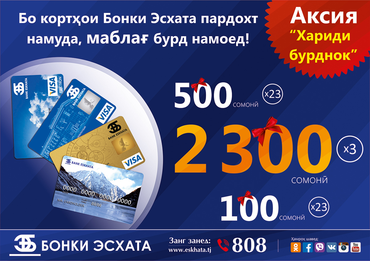 Внимание! По многочисленным просьбам держателей платежных карт Банка Эсхата и в честь празднования 25 годовщины 16-й сессии Верховного Совета Республики Таджикистан, банк объявляет о продолжении акции «Икдоми нав», с новым названием «Хариди бурднок»!