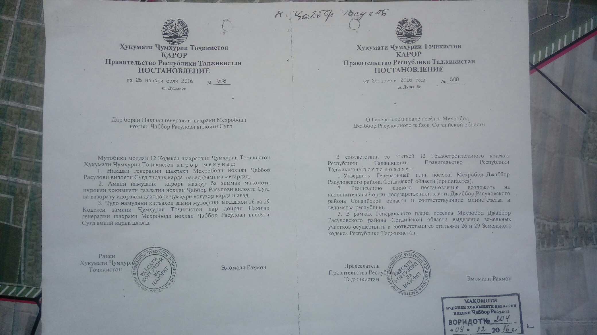 — По данным предпринимателей, когда в газете «Икбол» опубликовали несколько незаконных решений председателя района о признании недействительным права пользования землей, где построены магазины, три предпринимателя: Вахобов Холмат, Хакимов Азим и Халимов Насим — подали в экономический суд иск в отношении незаконного решения. По решению экономического суда Согдийской области в иске было отказано, но решением Высшего экономического суда данное решение было отменено в связи с незаконным мотивированием, а в отношении исполнительного комитета района и председателя земкома было вынесено частное определение. Бизнесмены спрашивают: почему власти и милиция района не признают судебный акт?
