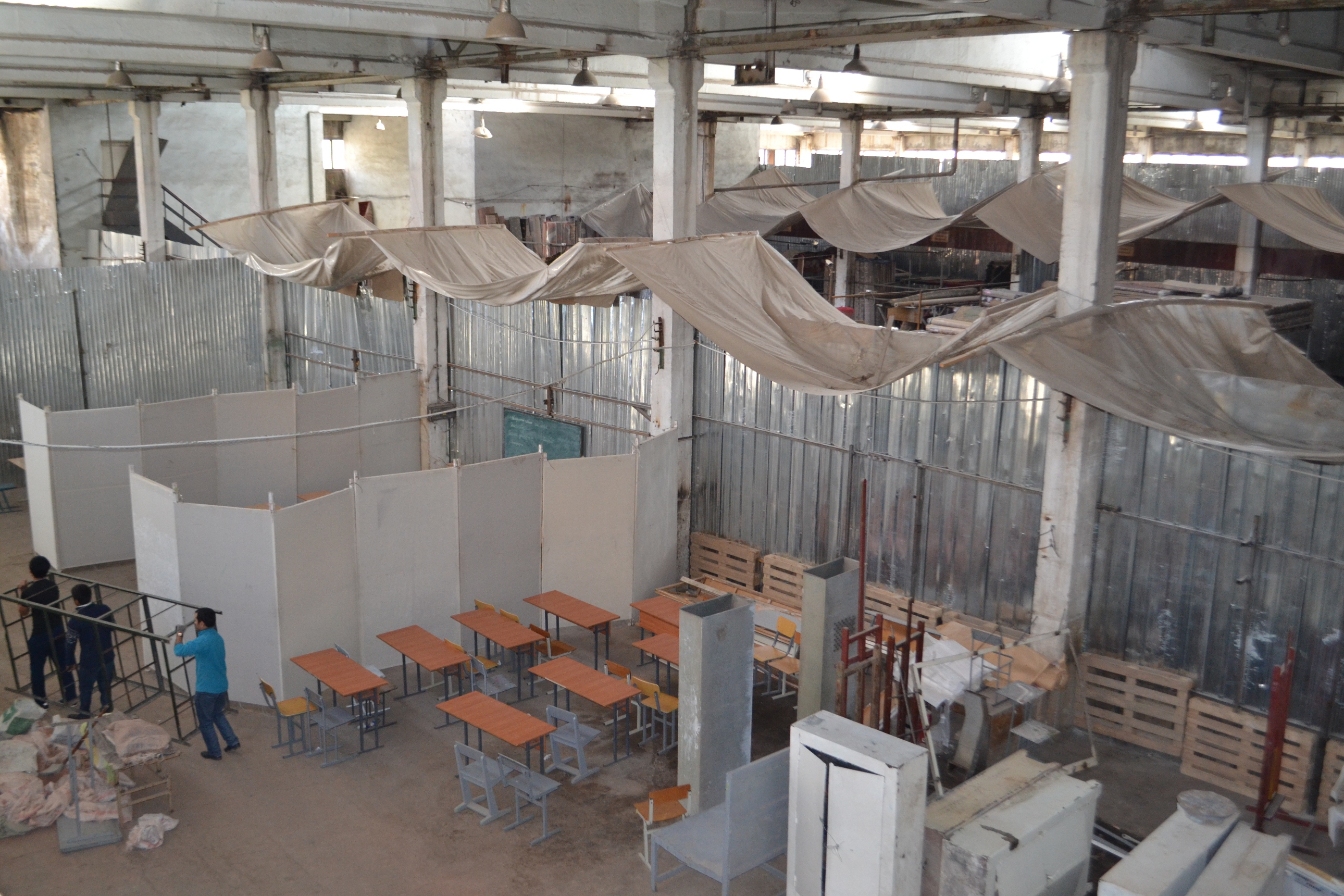 …Вместе с директором мы осмотрели некоторые временные «аудитории». В одной из них, например, я увидела большую решетчатую деревянную загородку посреди помещения, которая разделяла его на две части. Как оказалось, здесь учатся одновременно (!) по две группы студентов и им преподают два преподавателя одновременно. Как тут сосредоточиться на занятии?