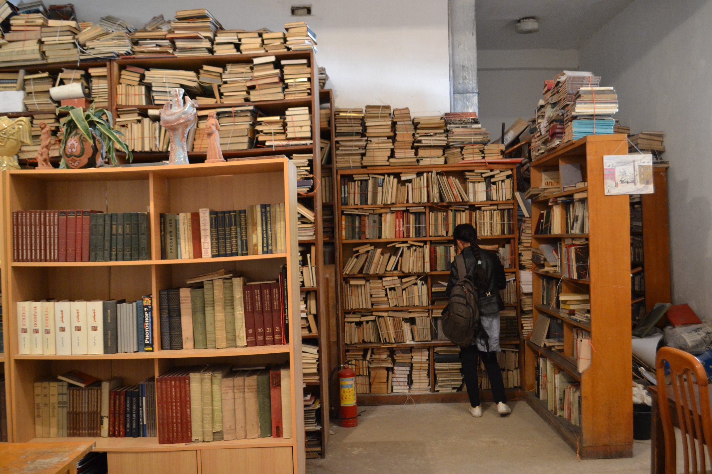 Прошли в библиотеку. Здесь тоже все «сидят на чемоданах»: большинство книг не распакованы, так и лежат связанные в стопках и в коробках; помещение без должного освещения, сырое. Что будет здесь зимой, если вдруг потечет потолок, даже страшно представить. А книги, кстати, уникальные, ведь собирались и писались бывшими преподавателями в течение полувека…