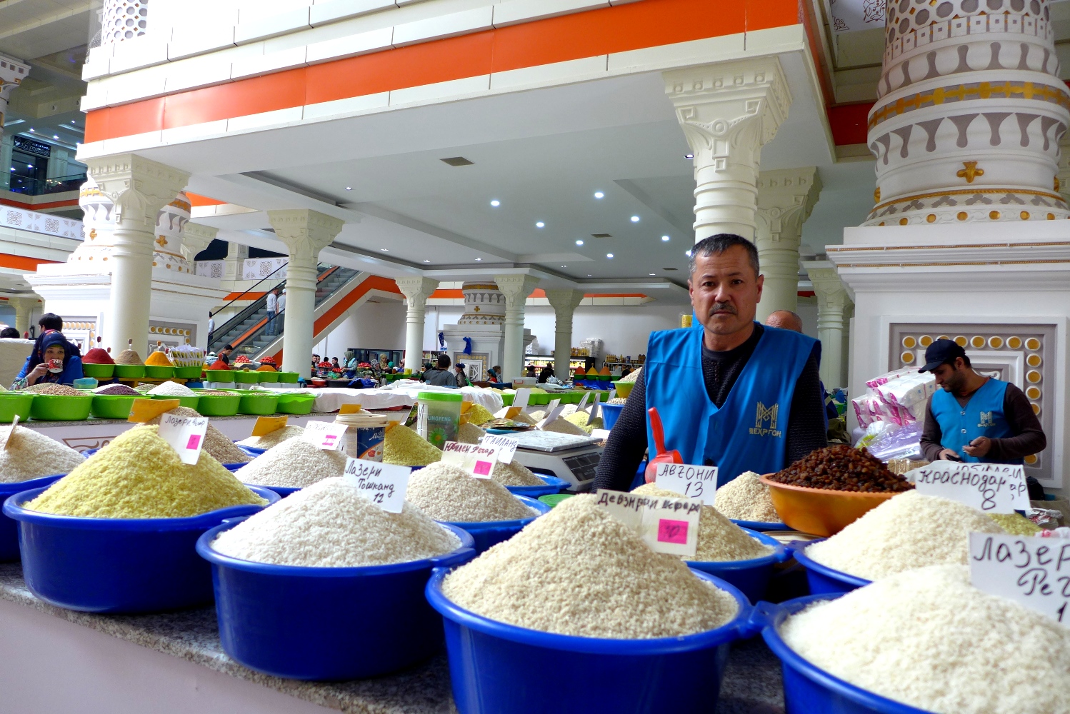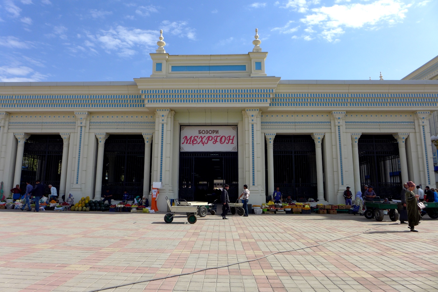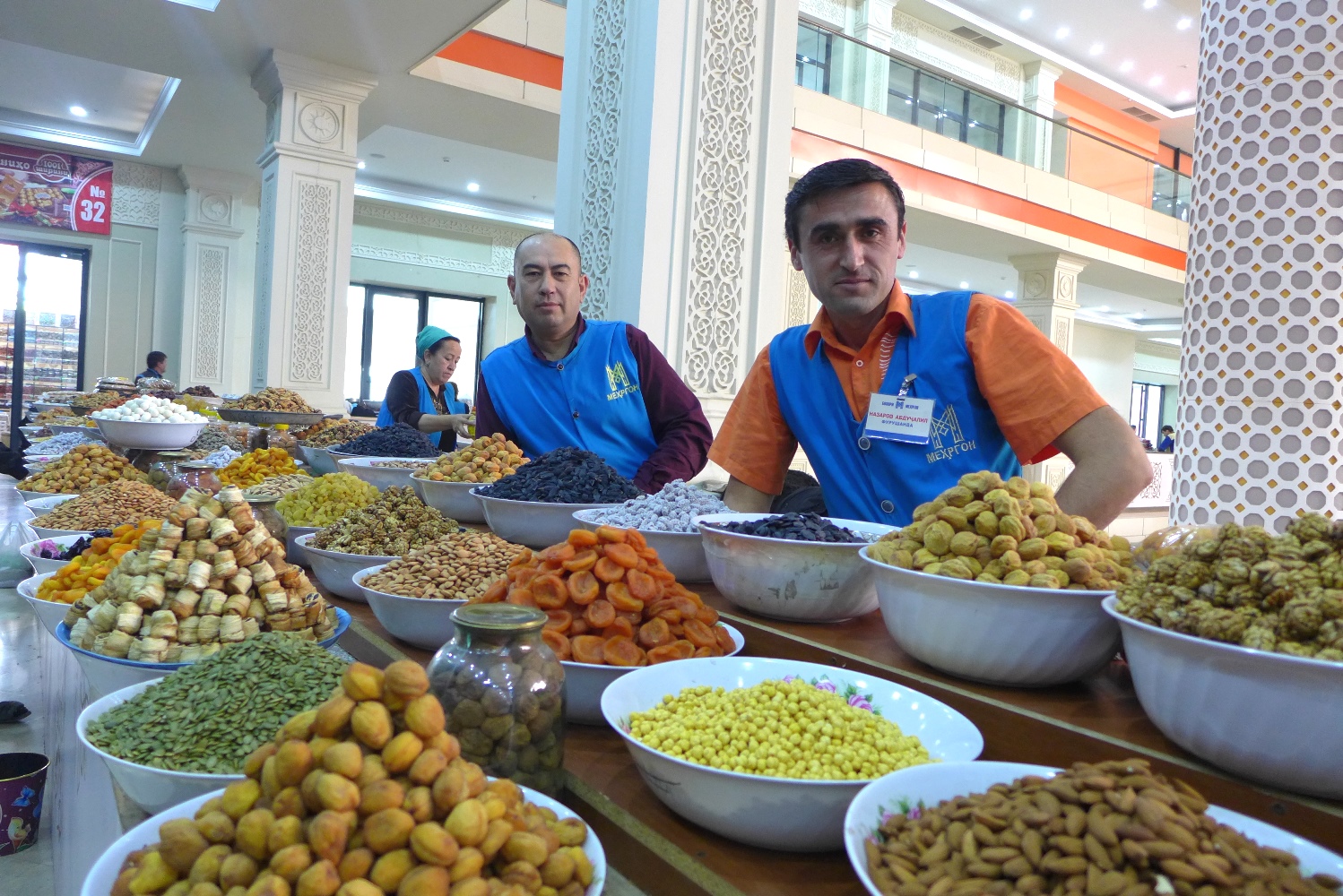 При входе на рынок стоят тележки, так что таскать с собой тяжелые сумки вам не придется. Половину продавцов уже переодели в форменную одежду «Мехргон», которую они должны купить за 70 сомони.