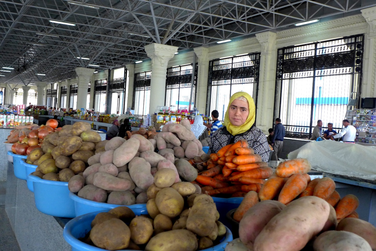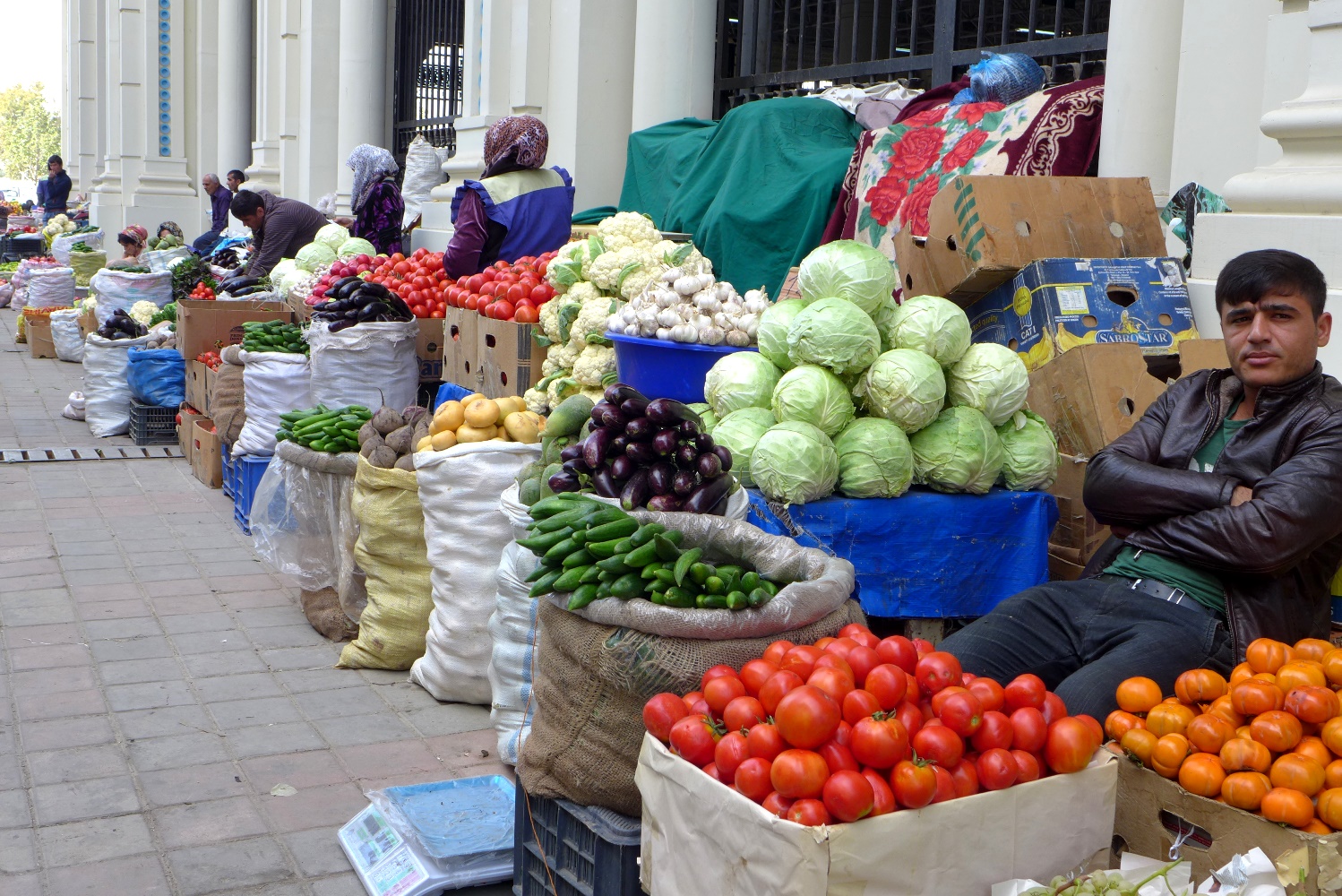 Вокруг «Мехргона» образовался стихийный рынок – тут мешками продают те же овощи, продавцы ждут завершения строительных работ на крытом оптовом базаре сельхозпродукции, на северной стороне рынка.