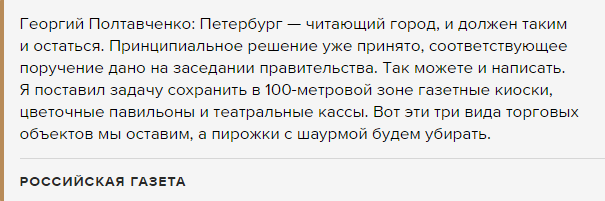 «Пирожки с шаурмой будем убирать», — сказал Полтавченко, отвечая на вопрос о планах администрации города убрать от метро нестационарные торговые точки.