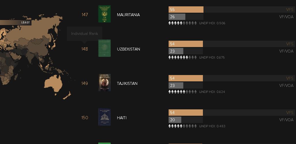 В обновленном рейтинге «самых сильных паспортов» (Individual Passport Power Rank) Таджикистан поделила 148-ое место с Узбекистаном и Гаити. Таджикский загранпаспорт позволяет таджикистанцам посещать без визы 54 страны мира.