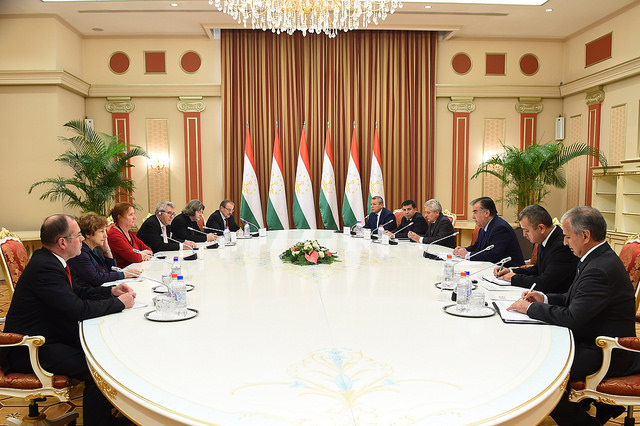 Вопросы сотрудничества Таджикистана с Европарламентом обсуждены в Душанбе на встрече президента Таджикистана Эмомали Рахмона с депутатами Европейского парламента под руководством Иветы Григуле. Встреча прошла 3 ноября.