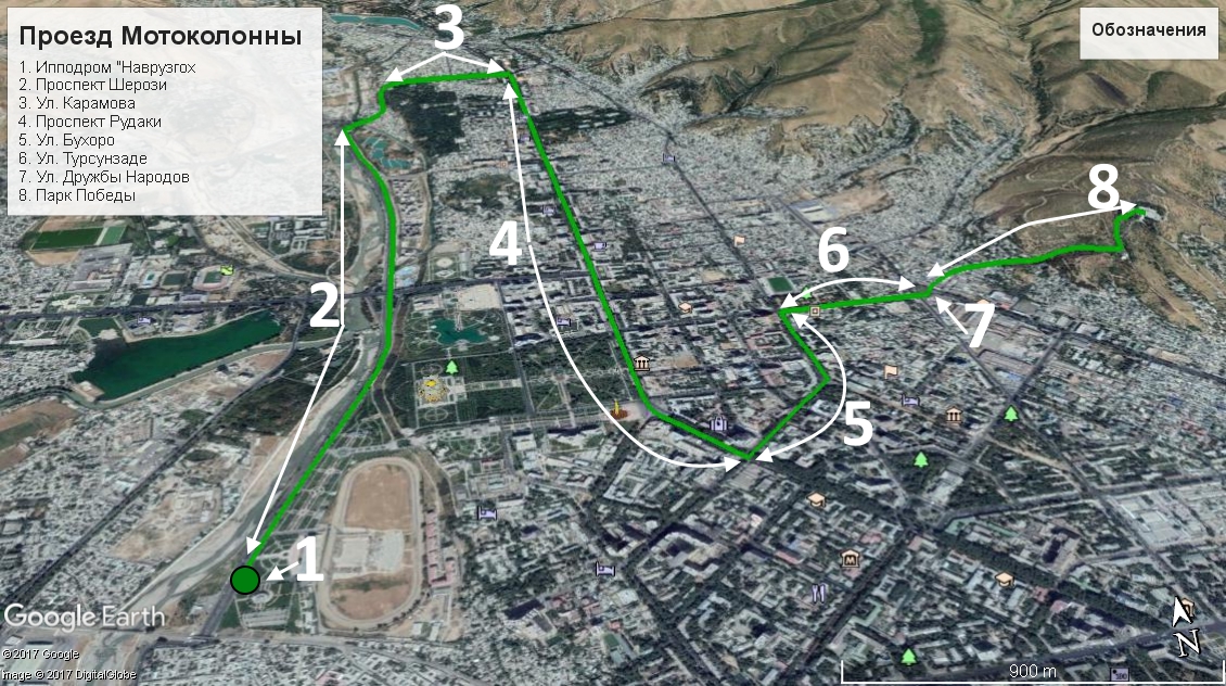 Мотоколонна пройдет от ипподрома Наврузгох по проспекту Шерози до ул. Карамова, далее до проспекта Рудаки, затем по проспекту Рудаки до перекрестка ул. Бухоро, далее по ул. Турсунзаде с выездом на ул. Дружбы Народов и затем до Парка Победы к мемориалу вечного огня, где будет организовано возложение цветов к вечному огню. Возложение цветов будет проходить под музыкальным аккомпанементом оркестра 201-ой Российской военной базы.