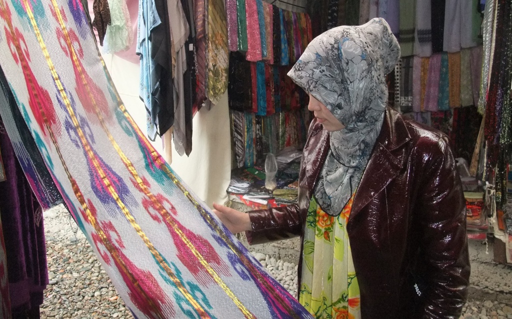 Все эти ткани в Таджикистане предназначены для пошива так называемых национальных платьев, которые представляют собой силуэт прямого кроя с короткими рукавами. Они сдобрены стразами, пайетками, стеклярусом – в общем, всем, чем угодно, лишь бы блестело. И, кстати, стоит такое великолепие очень недешево: цена отреза ткани – это 3,5 метра, которых хватает на платье и изоры (традиционные штаны под платье, – прим. ОА), — может доходить и до $500. И покупатели находятся, особенно если эта ткань нужна для приданого невесты.