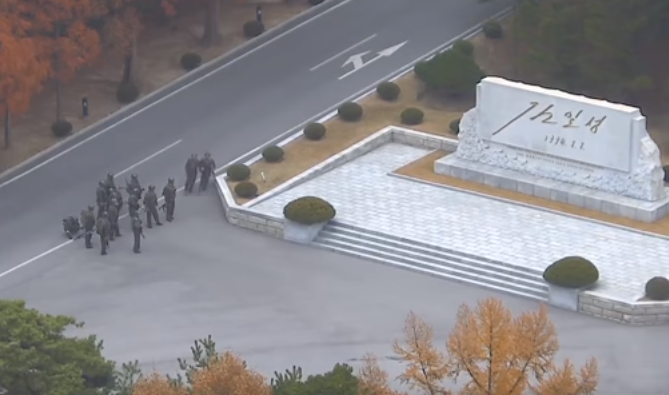 Затем в ролике демонстрируется запись с камер ночного видения, на которой видно, как южнокорейские пограничники спасают раненого солдата из пограничной зоны.