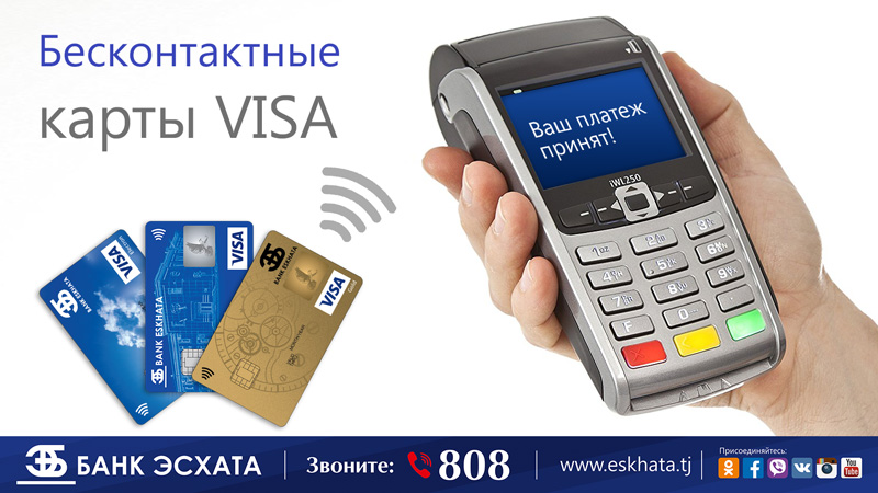 Держатели карт VISA могут обслуживаться во всех Торгово- сервисных предприятиях где установлены Пос-терминалы Банка Эсхата с символом бесконтакной оплаты. Также расширилась возможность оплачивать картами за пределами страны.