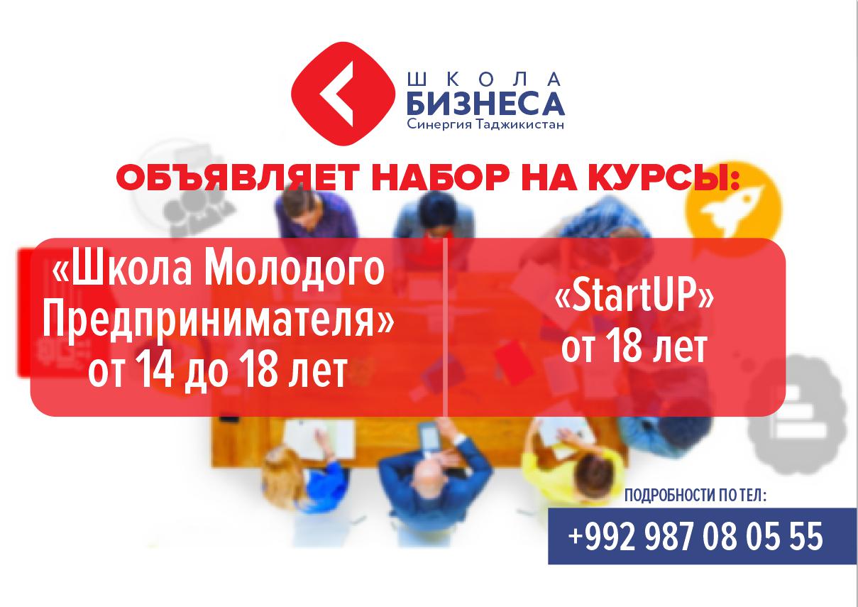 Школы Бизнеса «Синергия» Таджикистан запускает краткосрочные курсы: «Школа Молодого Предпринимателя» от 14 до 18 лет и «StartUP» от 18 лет.