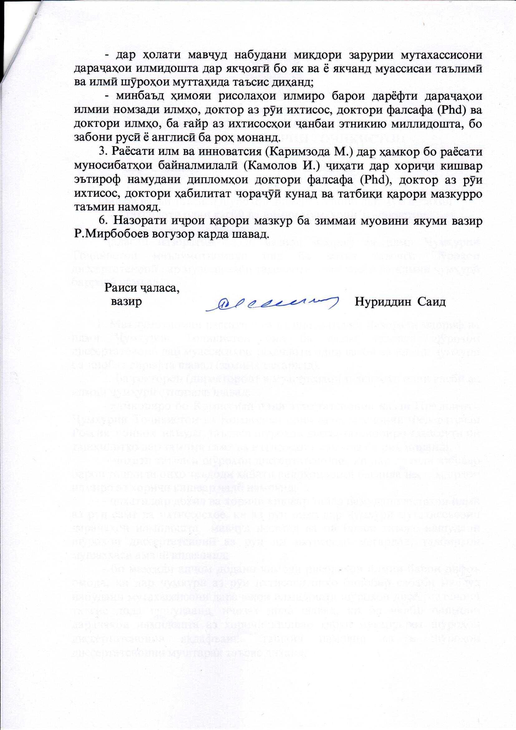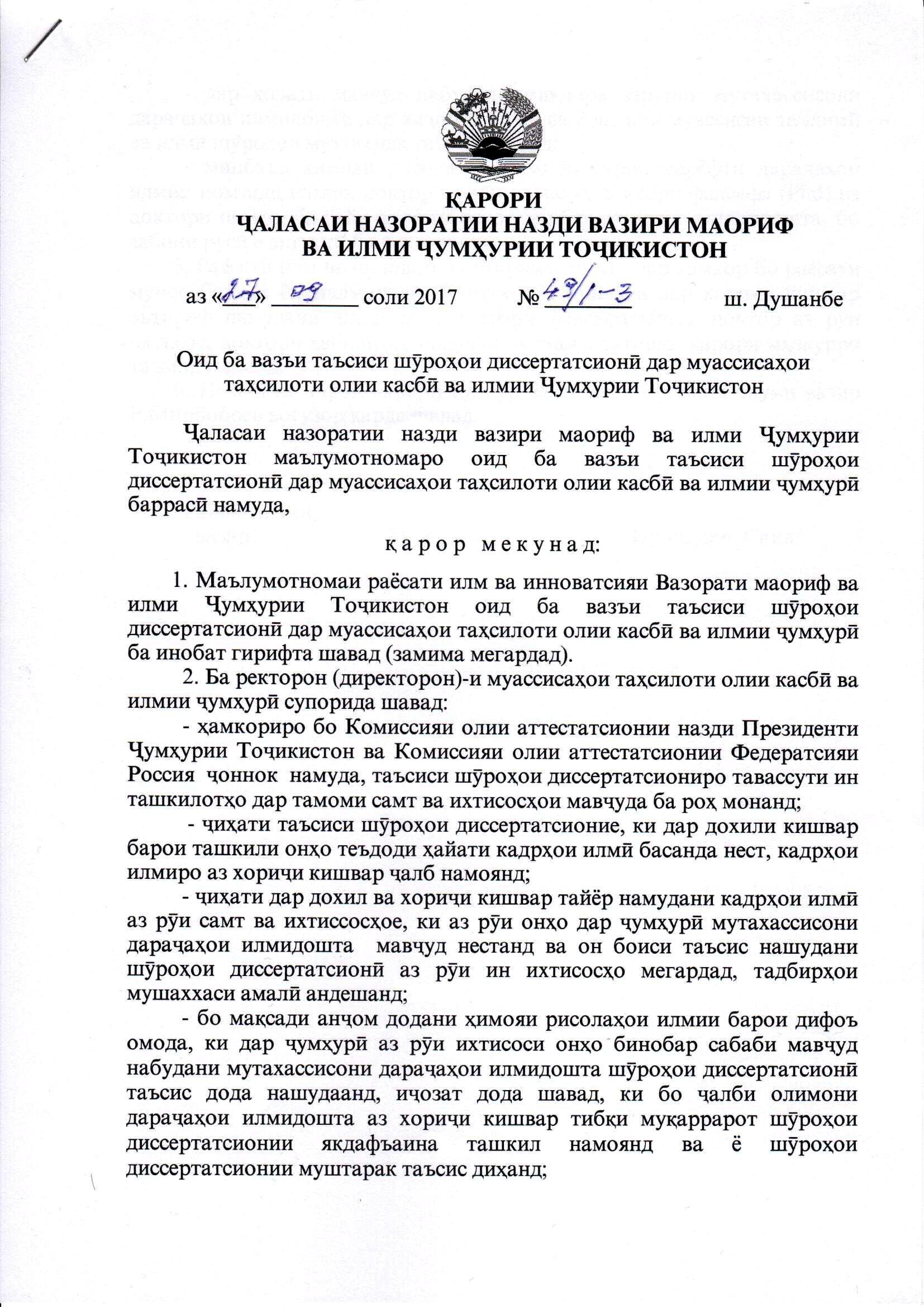 В соответствии с приказом главы Минобрнауки Нуриддина Саида от 27 сентября 2017 года за № 49/1-3 защита научных работ соискателей на получение научных степеней кандидатов наук, докторов наук по специальностям, доктора философии (Phd), кроме направлений, имеющих этнический и национальный характер, будет осуществляться на русском и английском языках.