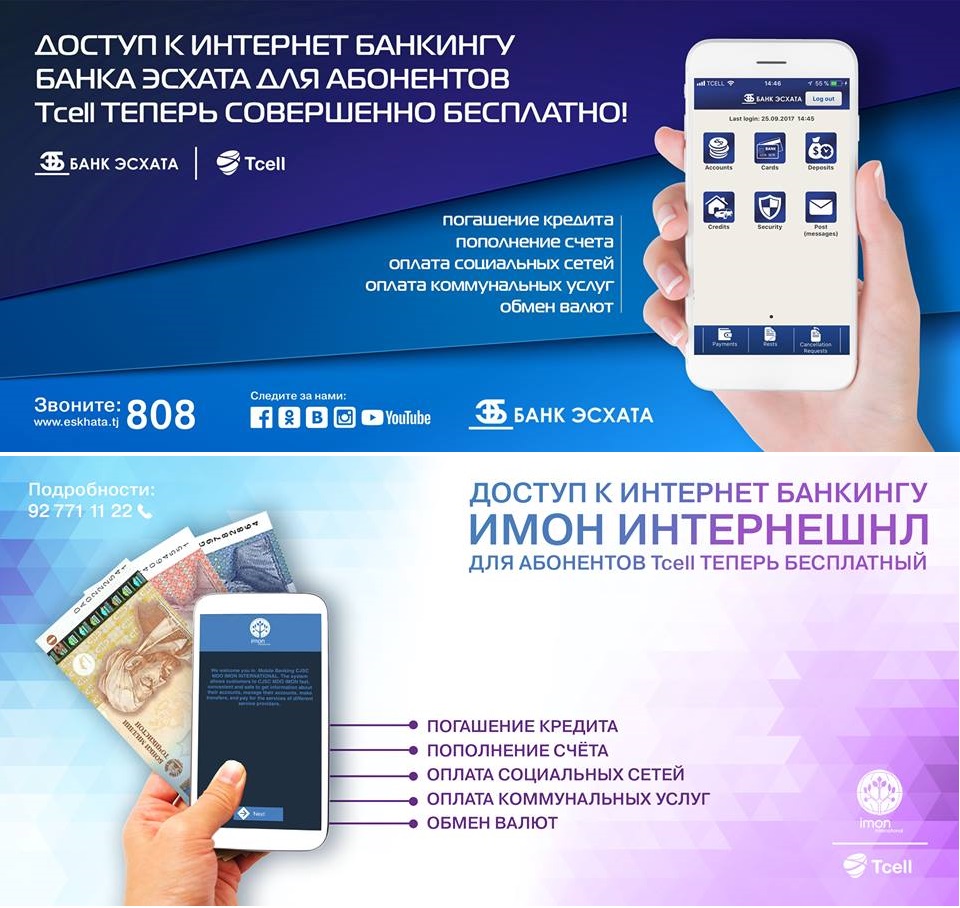 Абоненты компании Tcell, подключенные к Интернет-тарифам, могут пользоваться Интернет-банкингом в Банке Эсхата и ИМОН ИНТЕРНЕШНЛ абсолютно бесплатно!