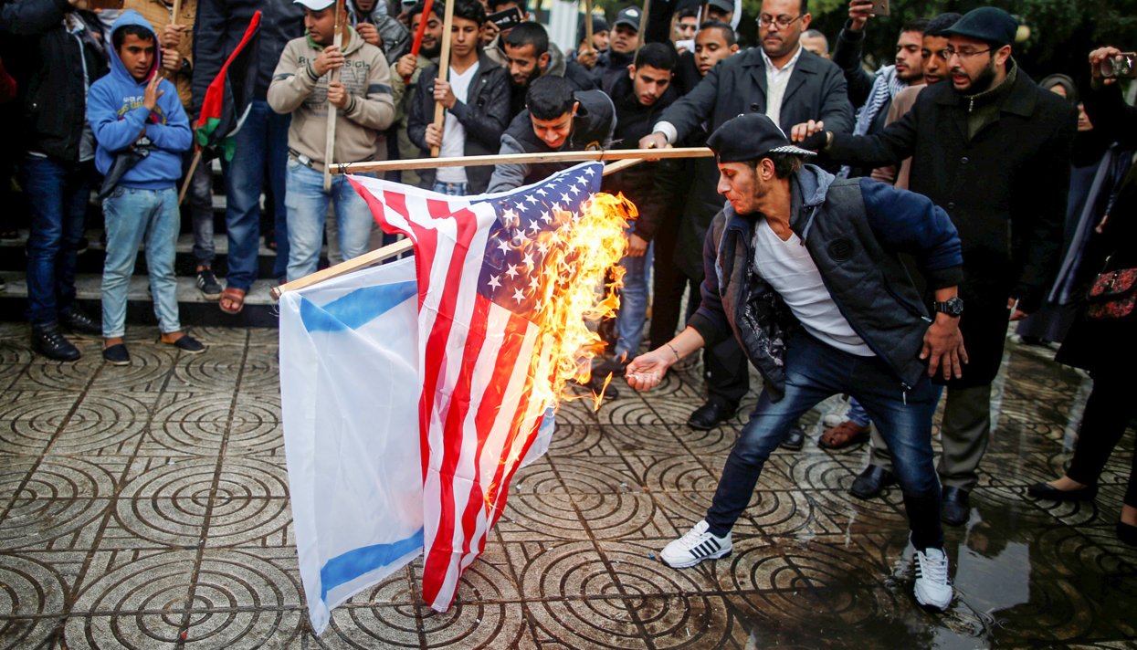 5 декабря, когда стало известно о намерении Трампа признать Иерусалим столицей Израиля, во многих израильских городах и в секторе Газа прошли акции протеста, на которых палестинцы жгли американские и израильские флаги и портреты Трампа.