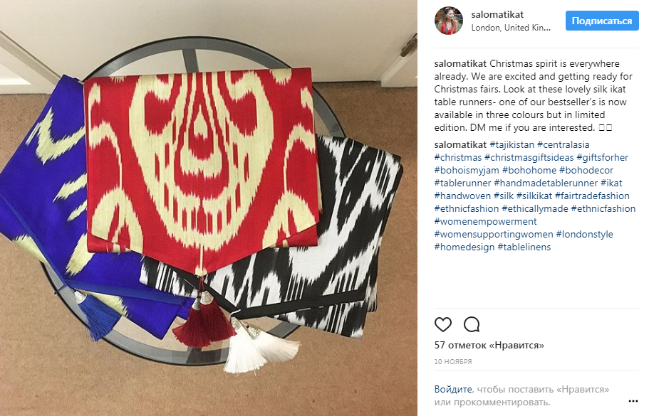 "На ярмарку я отвезла таджикские чапаны, европейские платья из таджикского адраса и атласа, клатчи и шарфы с национальными узорами, а также колоритные скатерти и подушки с вышивками. Все это было сделано руками таджикских мастериц из дальних районов Таджикистана. Помочь им с работой, сделать их творчество и мастерство прибыльным — и есть основная миссия Salomat Ikat", — делится предприниматель.