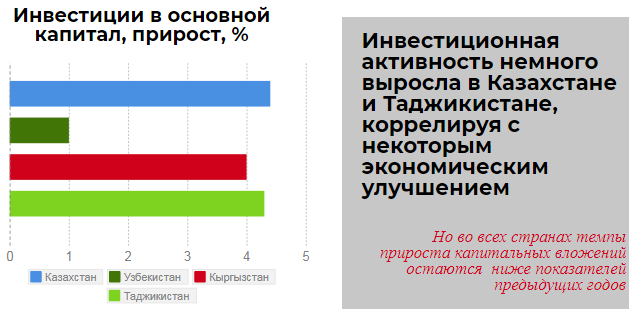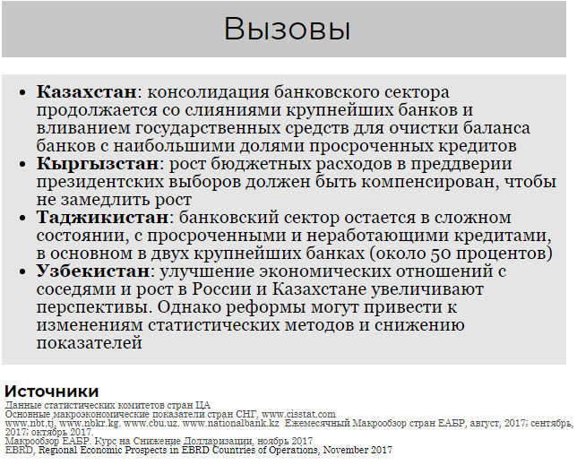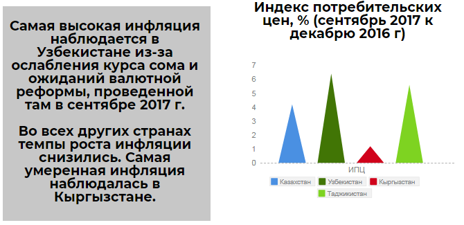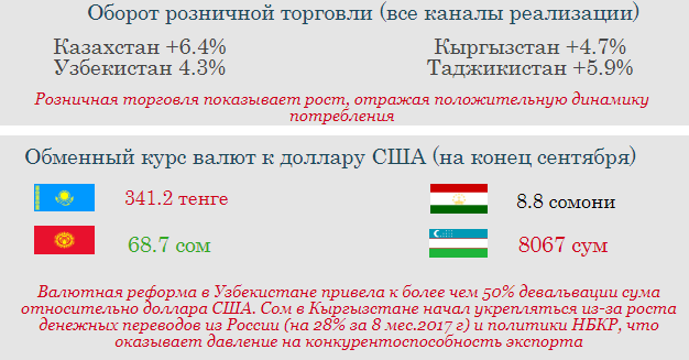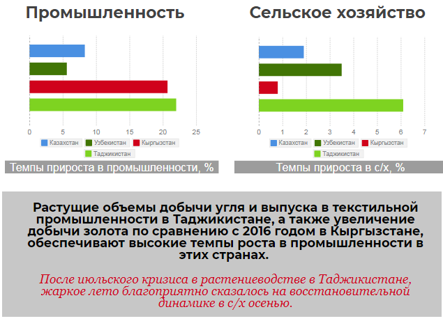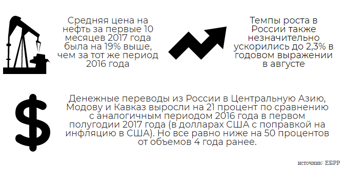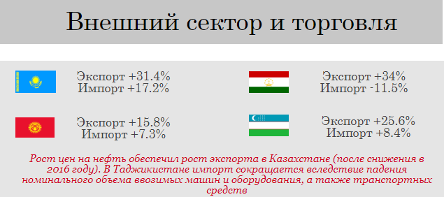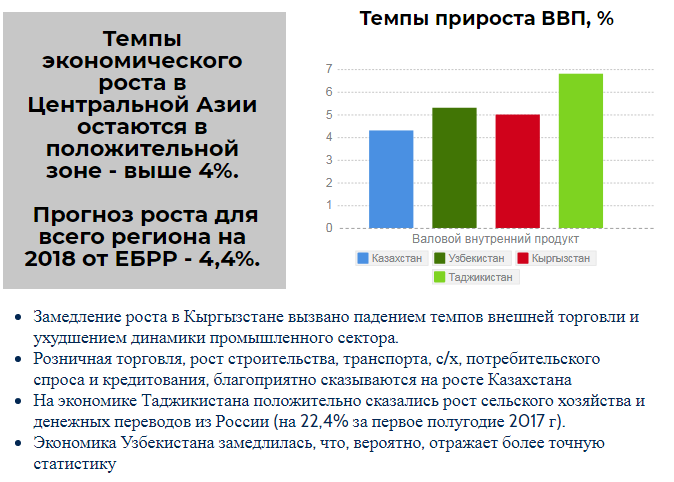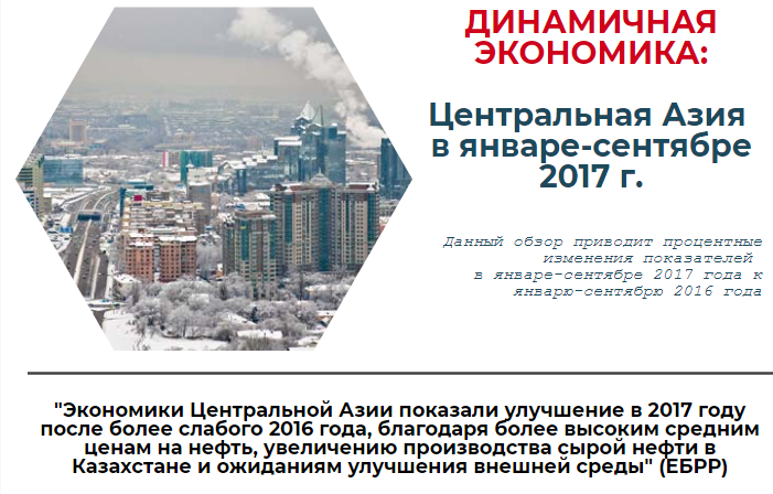 Страны Центральной Азии показали хороший экономический рост за первые девять месяцев 2017 года,после замедления в 2014-2016 годах. В странах-экспортерах сырьевых товаров рост был обусловлен увеличением производства в добывающем секторе (Кашаган в Казахстане) и ростом мировых цен на нефть выше 60 долл. за баррель. Рост российской экономики в свою очередь положительно сказался на странах, зависящие от потоков денежных переводов из России. Национальные валюты стабилизировались в большинстве стран в первые девять месяцев 2017 года, после значительных корректировок в предыдущие годы. В 2018 году прогнозируется дальнейший рост экономик региона в среднем на 4,4 процента, пишет CAA Network.