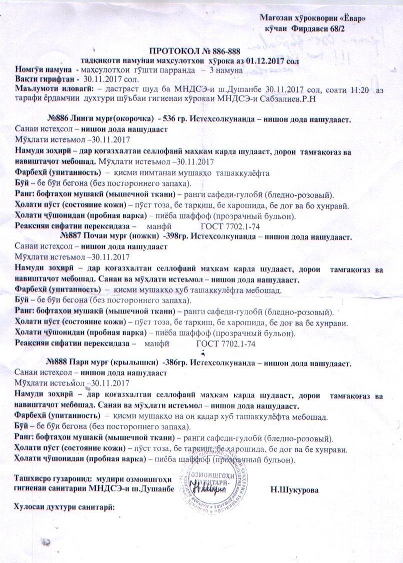 Спустя пять дней Таджикстандарт представил результаты проведенного исследования качества и безопасности переданного нами птичьего мяса.
