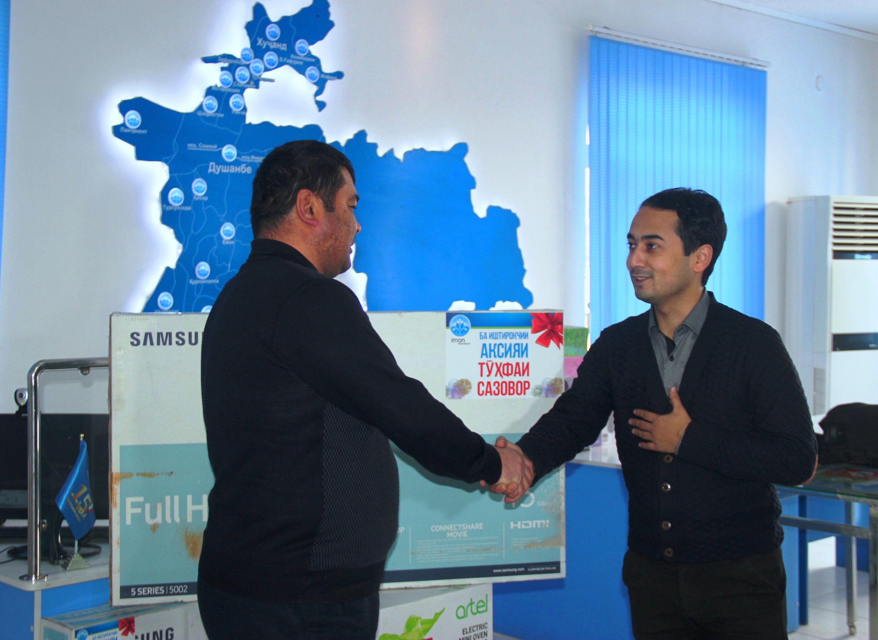 «Сегодня очень особенный день. Я получаю новый телевизор ультравысокого разрешения, и буду смотреть свои любимые фильмы в формате Full HD. «ИМОН ИНТЕРНЕШНЛ» надежный финансовый институт, которому можно доверить свои средства, и ещё получить гарантированный подарок. Это многого стоит, поверьте и мы предприниматели это ценим. Благодарю всех сотрудников и организаторов акции «Тухфаи сазовор» и желаю дальнейшего процветания «ИМОН ИНТЕРНЕШНЛ», -говорит клиент из Дж. Расуловского района.