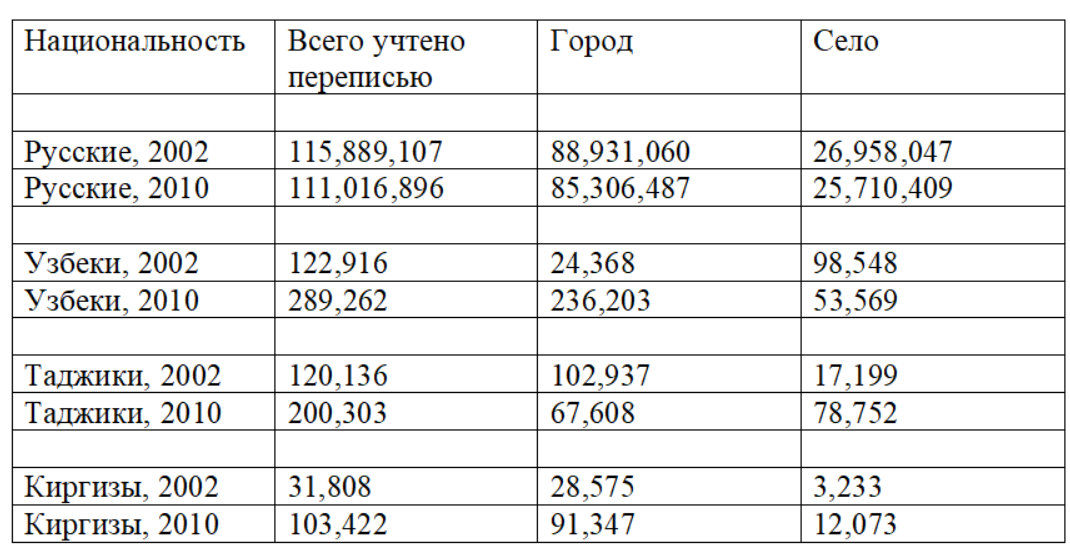 Данные двух всероссийских переписей населения – за 2002 и 2010 годы – показывают взрывной рост количества этнических таджиков, незначительное, но быстро растущее количество киргизов и почти двукратное падение количества этнических узбеков.
