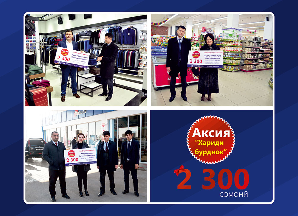 Джафъар Нурматов из города Душанбе, Абдуджалилов Эчод из города Худжанда, а также Татьяна Абдукаримова из Курган-Тюбе стали победителями завершающего тура акции «Хариди бурднок» от Банка Эсхата. Им вручены сертификаты на получение денежного приза в размере 2300 сомони.