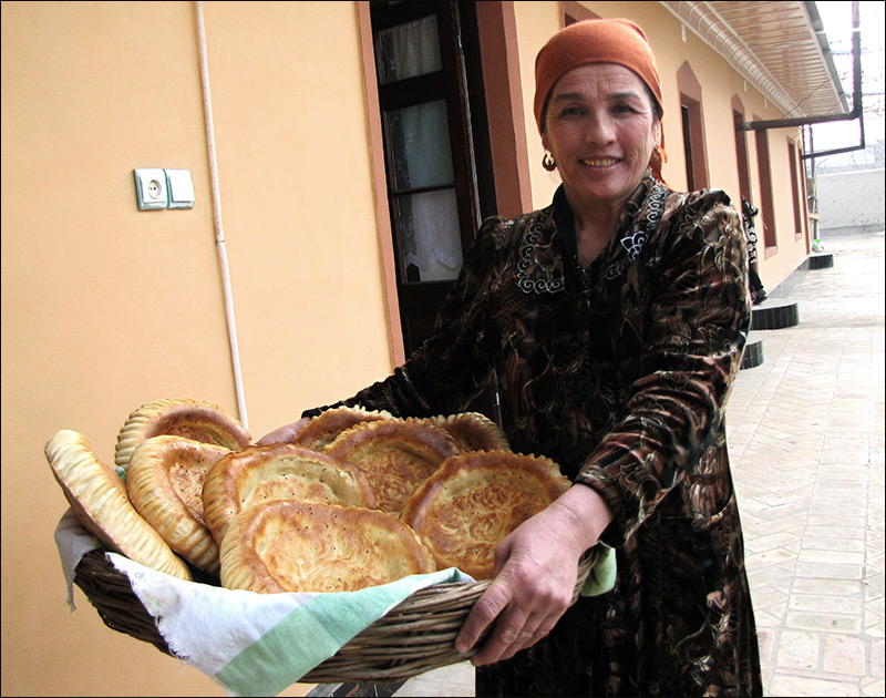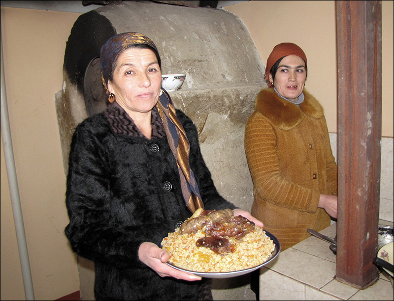 Трое из восьми детей Бикурбон Мамадкуловой получили собственные участки в том же селе, построили дома и живут отдельно. Однако от общего семейного коллектива они не оторвались. В доме 55-летнего сына Бикурбон-очи Назарджона Эргашева, который находится недалеко от родового гнезда, живут сам Назарджон, его супруга Угулджон, их дети Аюб и Акмал со своими супругами Анор и Мадиной, а также пятеро их детей. Мой визит в их дом совпал с процессом выпечки лепешек и приготовления самого любимого блюда таджиков — плова.