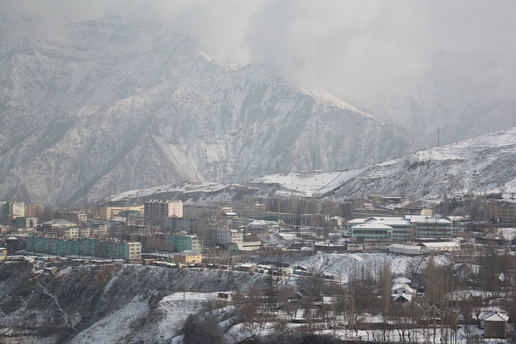 В самом низу города у многоэтажек нам повстречался мужчина. Он указал на ущелье далеко внизу, где течет Вахш. «Перед заполнением водохранилища тут построят дамбу, чтобы вода не смывала землю из-под города». Затем указал на склоны на северной части: «Вон за теми холмами – Оби Гарм; если идти по прямой, всего за час или полтора можно добраться».