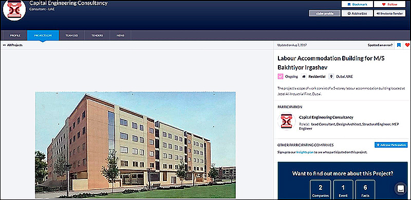 В августе 2017 года, спустя четыре месяца после визита Иноятова в Абу-Даби, инжиниринговая компания Capital Engineering Consultancy (ОАЭ) сообщила о том, что занимается реализацией проекта пятиэтажного жилого комплекса для рабочих, расположенного по адресу: Джебель Али Индастриал (Jebel Ali Industrial) 1, Дубай. То есть, здание возведут на территории специализированного промышленного парка в районе Джебель Али на западе Дубая, недалеко от крупнейшего на Ближнем Востоке порта Джебель Али и самой большой зоны свободной торговли в мире Джафза. Стоимость объекта оценивается в 45 млн дирхамов ($12,250 млн).