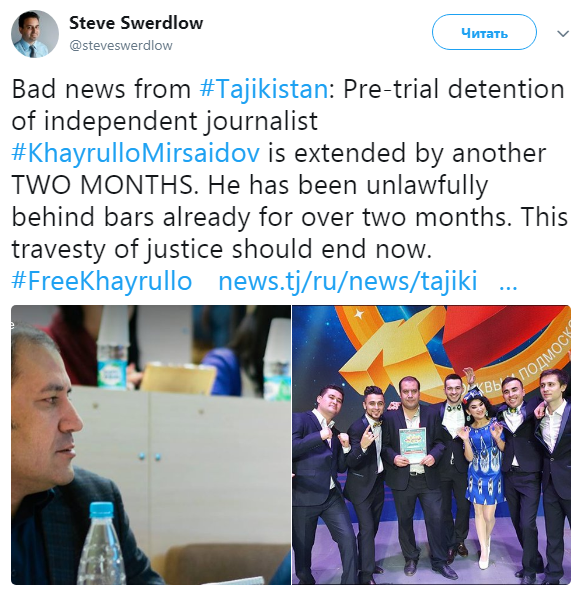 «Плохая новость для Таджикистана. Расследование уголовного дела в отношении журналиста Хайрулло Мирсаидова продлено еще на два месяца", — написал в Твиттере Стив Свердлов, представитель HRW по Центральной Азии 10 февраля.