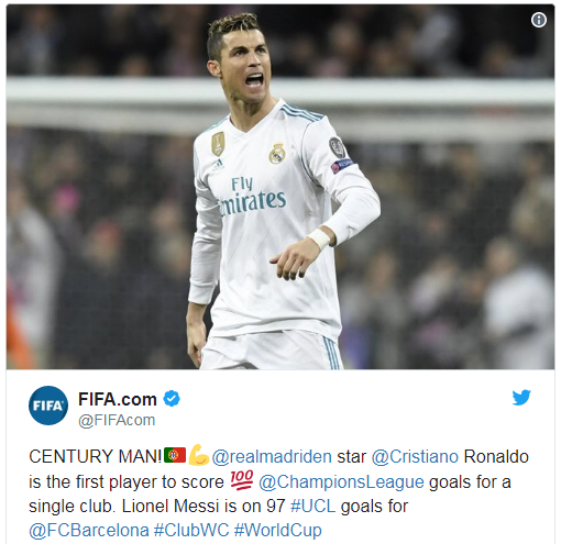 Всего на счету Роналду 117 забитых мячей в Лиге чемпионов. Он является лучшим бомбардиром в истории турнира. Его ближайший преследователь Лионель Месси забил 97 мячей за «Барселону» в Лиге чемпионов.