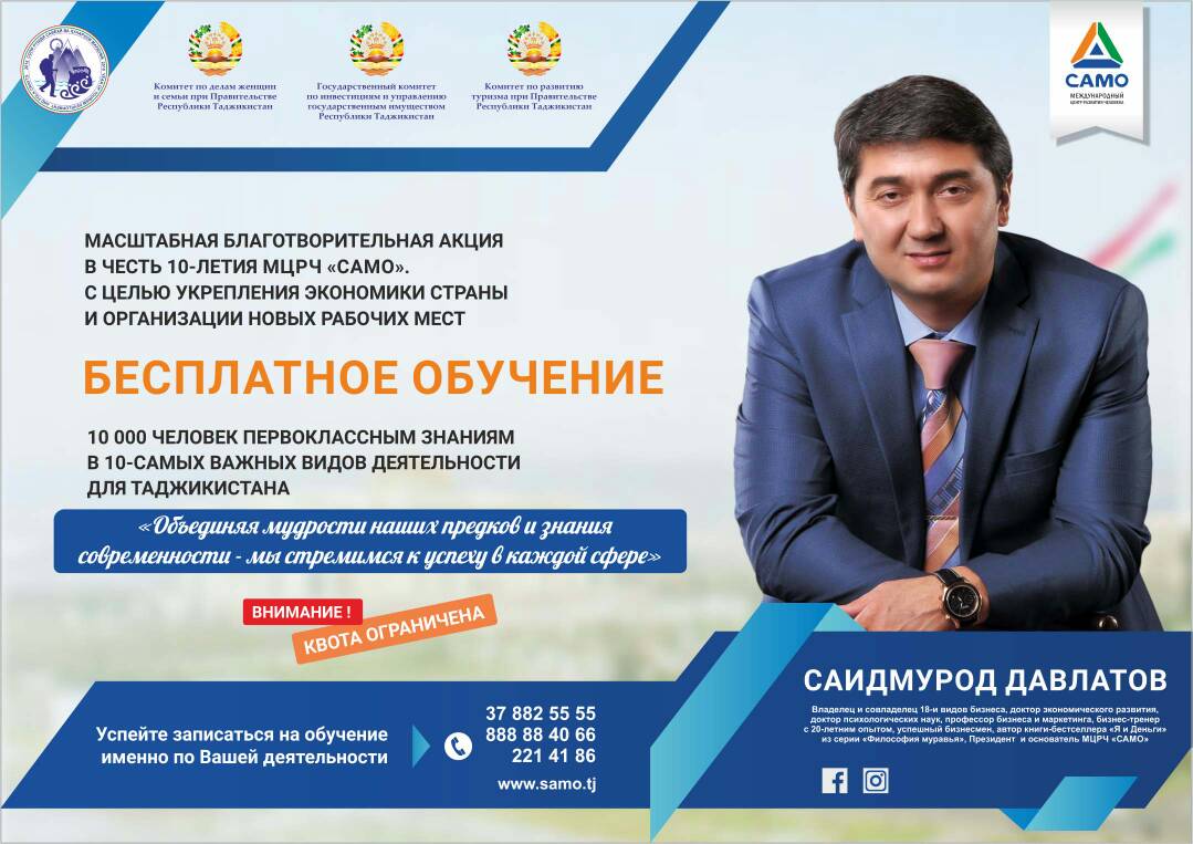 С марта нынешнего года в Душанбе стартует образовательный благотворительный проект в честь 10-тилетия Международного центра развития человека «САМО», принять в котором может каждый желающий. О подробностях рассказал основатель и президент МЦРЧ «САМО», бизнес-тренер Саидмурод Давлатов.