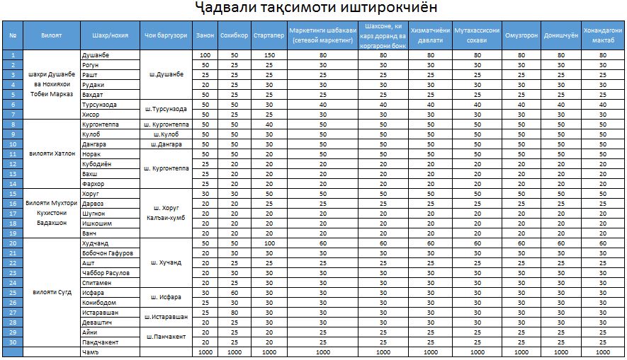 — Наш образовательный проект строго регламентирован. В каждой группе действует определенное количество квотных мест, распределенных практически на все регионы страны, а именно, на  Душанбе, Турсунзаде, Кургантюбе, Куляб, Дангару, Худжанд, Исфару, Истаравшан и Пенджикент (см. таблица 1). В связи с этим рекомендую записываться в подходящие для Вас группы заблаговременно.