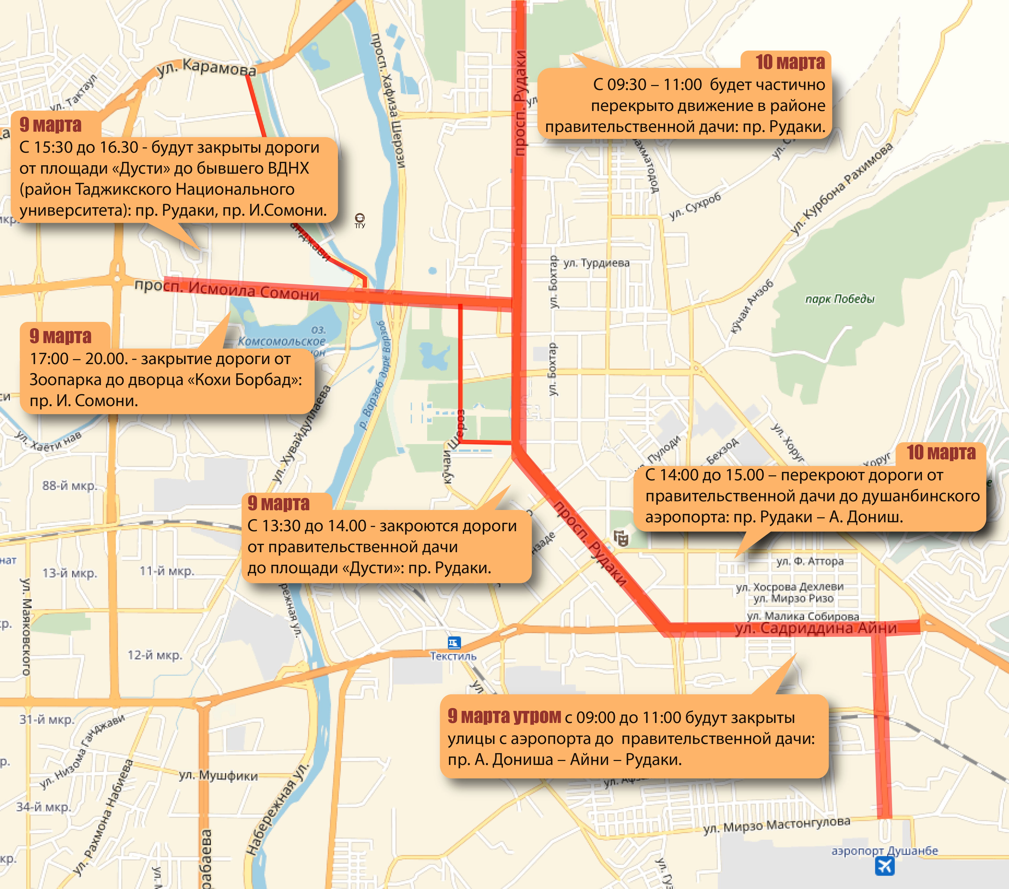 9 марта утром с 09:00 до 11:00 будут закрыты улицы с аэропорта до правительственной дачи: пр. А. Дониша – Айни – Рудаки.