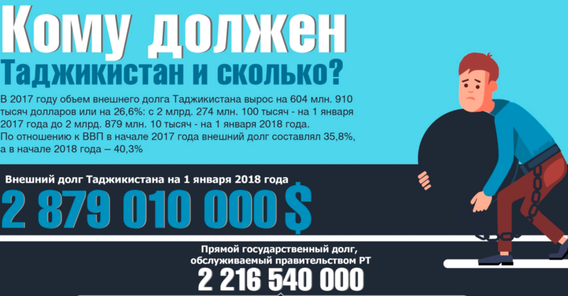 Размер государственного долга Таджикистана на начало текущего года достиг почти 3 миллиардов 670 миллионов долларов. Данный показатель равен 51,4% ВВП страны.