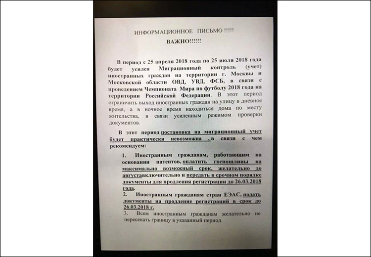 До начала чемпионата еще почти три месяца, но мигранты уже взбудоражены не на шутку. В местах, где они работают, а также в соцсетях бродят фиктивные объявления о необходимости продлевать регистрации и патенты. К тому же ходят слухи о том, что на время состязаний мигранты не смогут въезжать на территорию России. И хотя законных оснований для таких слухов как будто нет, люди им верят и передают дальше, распространяя панику и хаос.