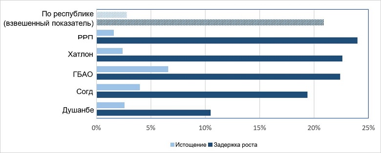 Показатели задержки роста и недоедания у детей в Таджикистане значительно отличаются в сельской и городской местности. Страдающие от недоедания дети в основном живут в сельской местности в районах республиканского подчинения и Хатлонской области, за которыми следует сельская местность в Согдийской области. В Горно-Бадахшанской автономной области населения меньше, чем в других регионах, но относительно высокий уровень задержки роста у детей.