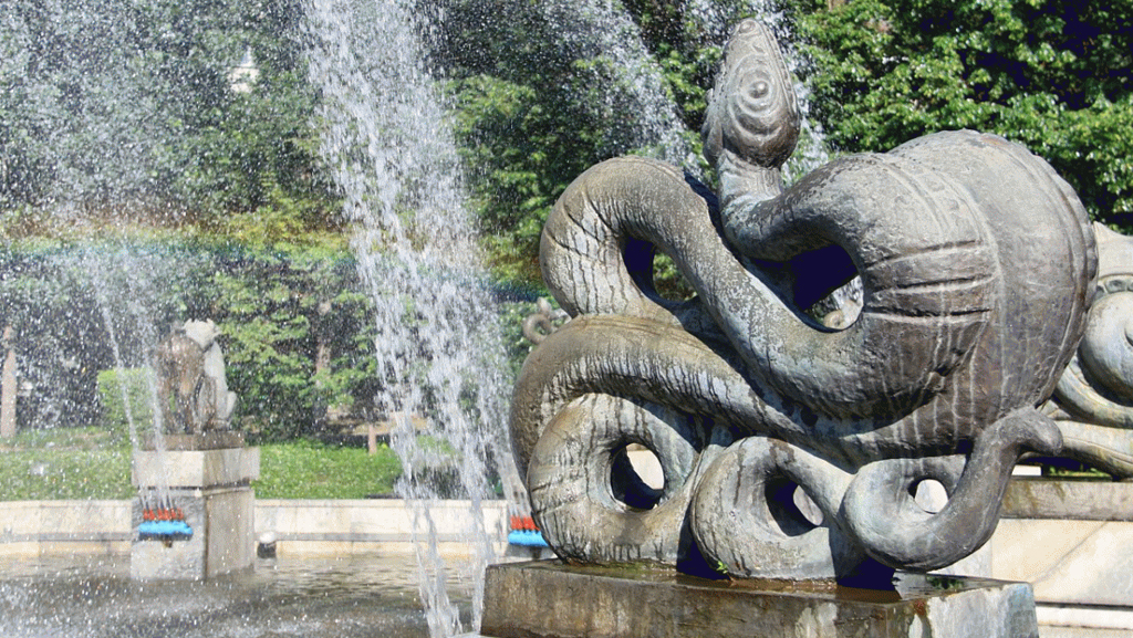 Дно фонтана украшает мозаика из смальты. В центре бассейна – солнце с 216 лучами, установленное на обелиске, а вокруг – 12 фигур, отлитых из бронзы. Они символизируют полный цикл 12-годичного восточного календаря. На самом деле фонтан наполнен куда более глубокой и самобытной идеей.