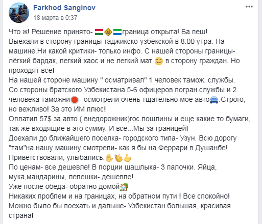 «Что же: решение принято, граница открыта! Ба пеш! Выехали в сторону границы таджикско-узбекской в 8:00 утра. На машине. Никакой критики — только инфо. С нашей стороны границы- лёгкий бардак, легкий хаос и нелегкий мат в сторону граждан. Но проходят все! На нашей стороне машину осматривал 1 человек таможенной службы. Со стороны братского Узбекистана 5-6 офицеров пограничной службы и 2 человека таможни — осмотрели очень тщательно мое авто. Строго, но вежливо! За это им плюс», — рассказал в паблике в ФБ «Мы таджикистанцы» Farkhod Sanginov и добавил, что «всё, всё в Узбекистане намного дешевле».
