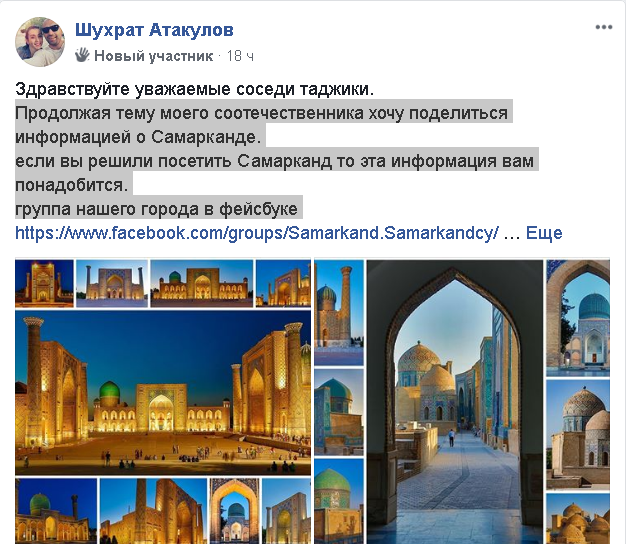 Пользователь из Узбекистана Шухрат Атакулов пригласил всех в Самарканд, предложив о городе всю информацию и пригласив таджикистанцев в группу о Самарканде.
