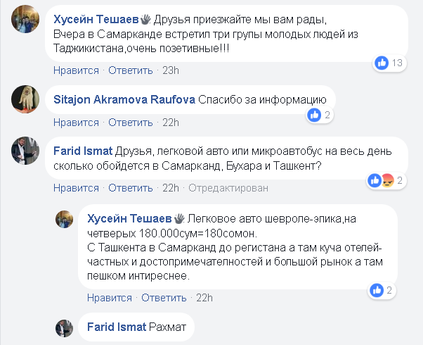 «Спасибо Таджикскому народу за гостеприимство! – написал в соцсети Нодир Ахмедов из Самарканда. — Вчера на своем авто ехал в Душанбе со стороны Самарканда! Хорошие, вежливые сотрудники ГАИ! Братскому народу Таджикистана — всем вам низкий поклон за гостеприимство! Никогда не был в Таджикистане, вчера первый раз поехал, покатался на своем авто по городу Душанбе, Пенджикенту, все отлично — проблем нет! Респект узбекскому и таджикскому народам! Спасибо нашим президентам».