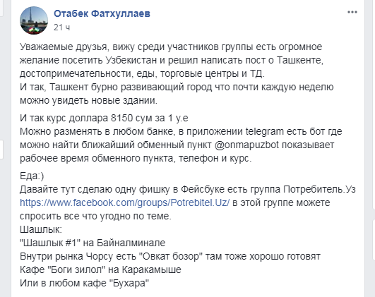 Другой — Отабек Фатхуллаев — расписал подробную инструкцию о том, где поесть в Ташкенте, где обменять валюту.