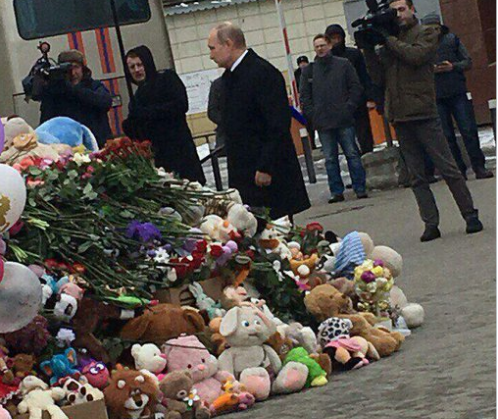 Президент положил букет роз у фасада здания, куда люди приносят цветы, мягкие игрушки и фотографии погибших. После он осмотрел фасад сгоревшего ТЦ вместе с полпредом в Сибирском федеральном округе Сергеем Меняйло.