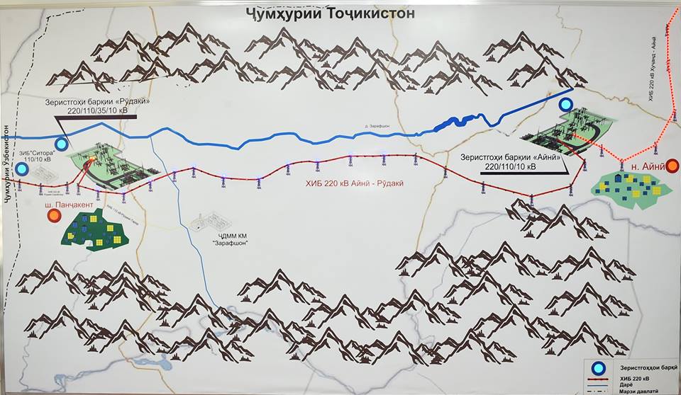 Линия электропередачи 220 кВ «Айни-Рудаки» берет свое начало с подстанции «Айни» в районе Айни и протягивается до подстанции «Рудаки» в Пенджикенте.