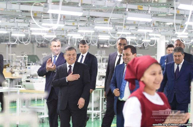 На фотографиях, сделанных во время ознакомления Шавката Мирзияева с работой текстильного предприятия и опубликованных на сайте президента, запечатлены сидящие за швейными машинками девушки в одинаковой красной униформе и глава государства, который с большим воодушевлением здоровается с молодыми швеями.