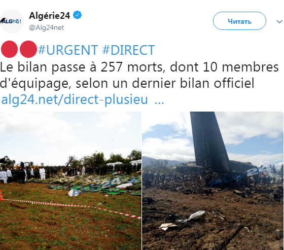 Самолет ВС Алжира Ил-76 разбился 11 апреля в поле неподалеку от аэропорта города Буфарик, расположенного в 30 километрах от столицы Алжира. Самолет потерпел крушение вскоре после взлета.