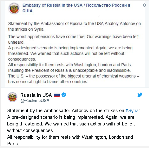 «Вся ответственность [за последствия авиаудара] лежит на Вашингтоне, Лондоне и Париже. Оскорблять президента России неприемлемо и недопустимо. США — обладатель крупнейшего арсенала химического оружия — не имеет морального права винить другие страны», — сказано в заявлении посла Анатолия Антонова.
